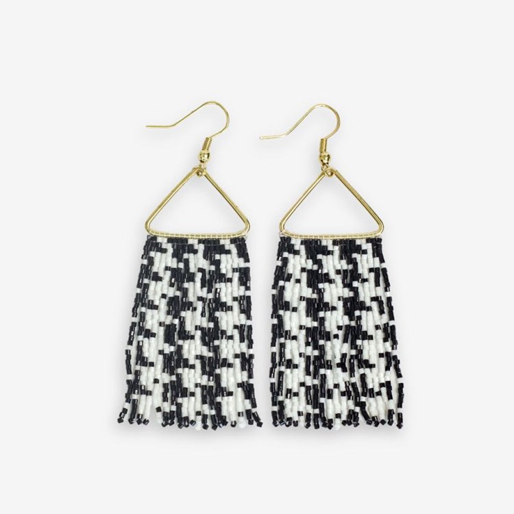 Add a touch of sophistication and style to your outfit with these Paige bead fringe earrings in a classic houndstooth pattern. The intricate beadwork and fringe detailing create a unique and eye-catching look that is sure to turn heads. These earrings are perfect for adding a pop of texture and movement to any ensemble, whether you're dressing up for a special occasion or just adding a bit of flair to your everyday look. With their versatile design and timeless pattern, these earrings are a must-have accessory for any fashion-forward individual.