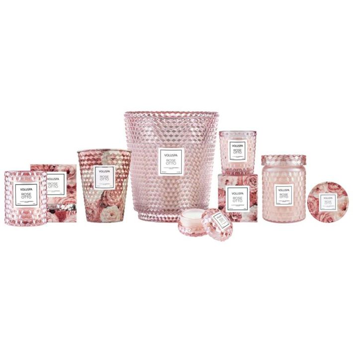 Notes of Steamed Distilled Rosa Damascena Flower Tops & Bulgarian Rose Essential Oil. One wick custom glass candle with a matching glass lid. Voluspa's best-selling format gets an update with a 3D geometric cube pattern! Youll love using the jar for jewelry, flowers or decor long after the candle is gone.