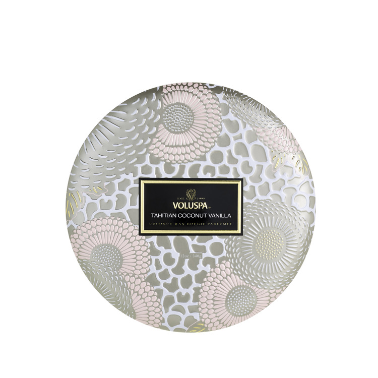 Escape to a tropical paradise with Voluspa's Tahitian Coconut Vanilla candle. This luxurious scent combines the sweet aroma of white peach, creamy coconut milk, and rich vanilla bean for a truly indulgent experience. The 12 oz. metal vessel is beautifully decorated with a Japonica pattern, making it a stylish addition to any room. With three wicks, this candle provides a strong fragrance throw that will fill your space with the delightful scent of Tahitian Coconut Vanilla for up to 40 hours. No need for SPF - just sit back, relax, and let the exotic fragrance transport you to a sun-drenched island getaway.